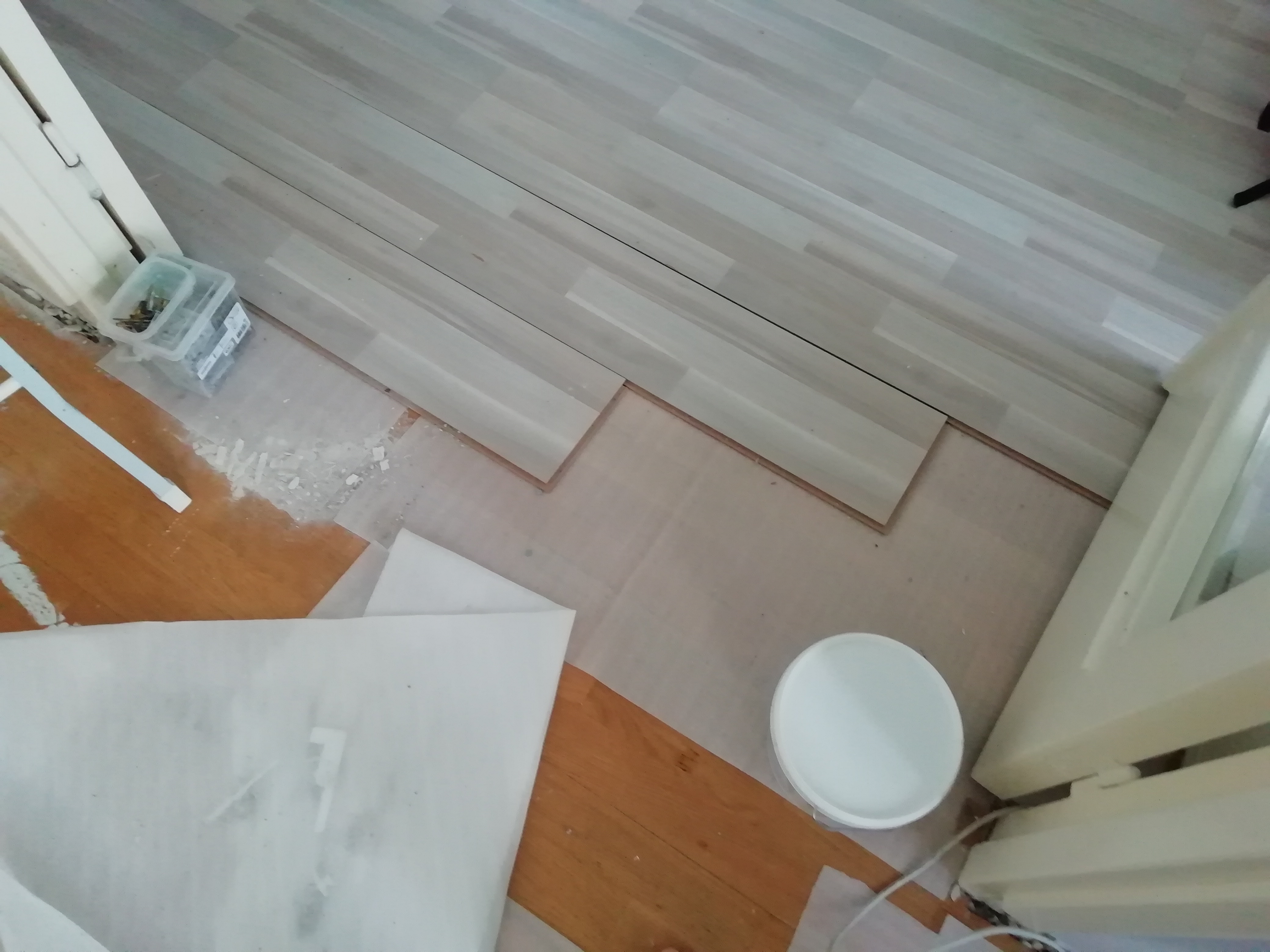 Koska asunto oli muutenkin pienen pintaremontin puutteessa ja koska keittiön ja seinän vuoksi joutuisimme joka tapauksessa uusimaan myös lattiat koko huoneistoalalta, päätimme hoitaa koko homman samalla kertaa. Eli katosta lattiaan listoja myöten.
